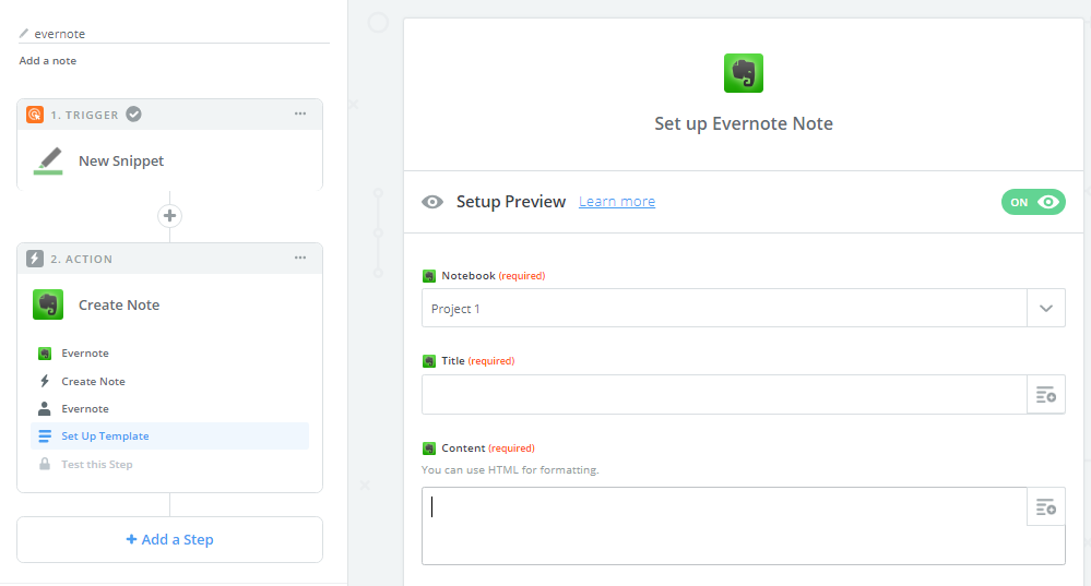 8. Select the Action that Evernote should take (Create Note) & Click Continue